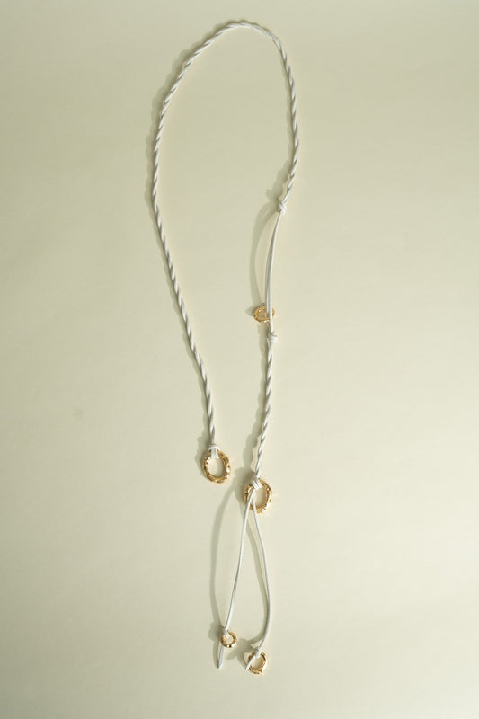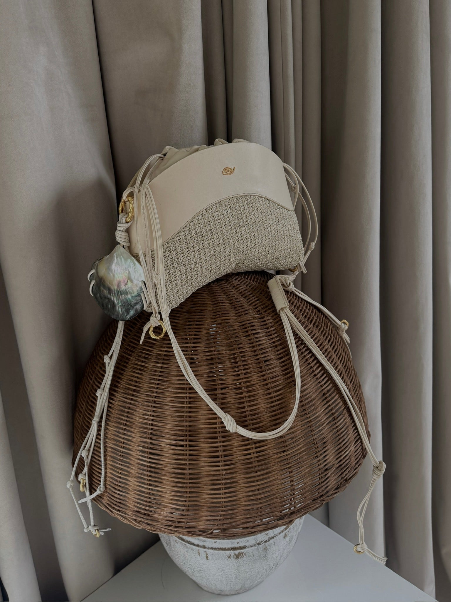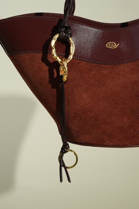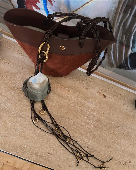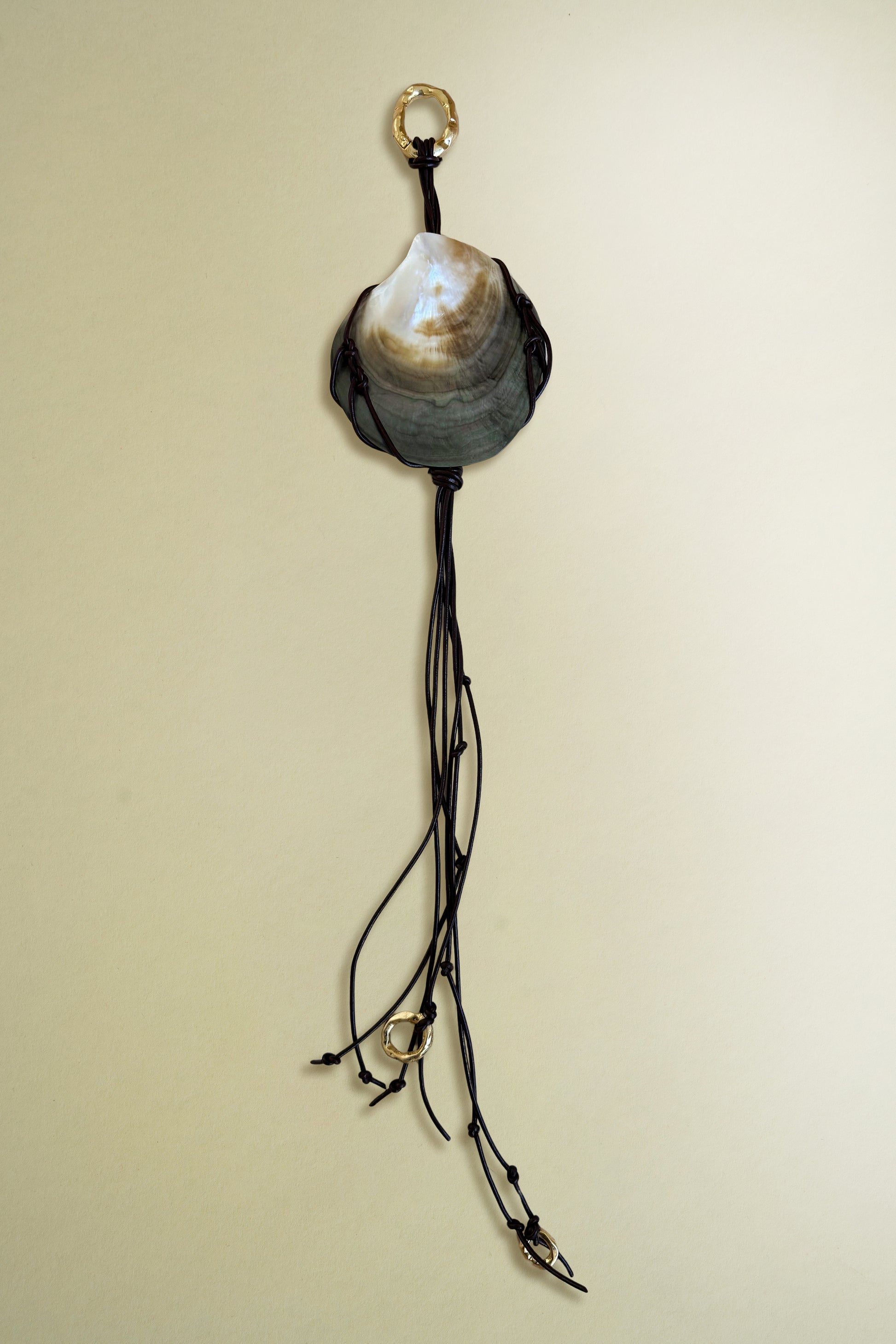 This mother of pearl shell—individually sourced and hand-bound in leather cord—is suspended from a textured brass ring, cast in our signature organic form. Each piece is unique, shaped by the sea and the passage of time. Designed to accompany the everyday. Meant to be carried—on a bag, key ring, or belt loop—as a subtle expression of form and texture.